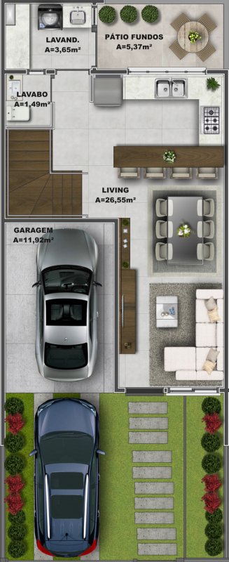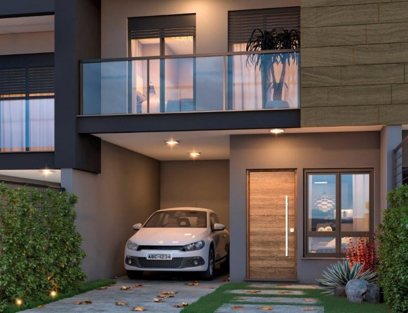 Excelete sobrado, com fachada moderna e detalhes em porcelanato.