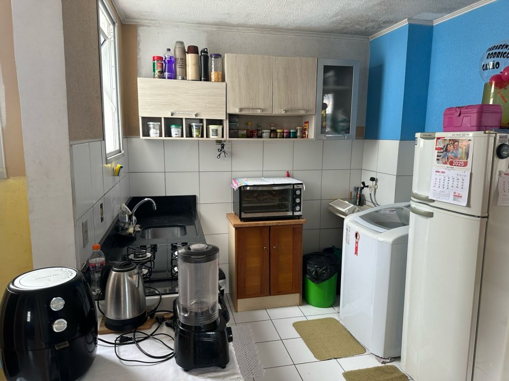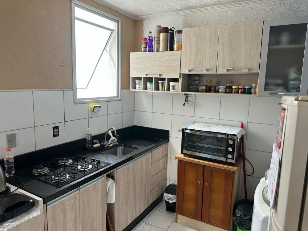 Apartamento de 2 dormitórios, cozinha com bancadas de granito e armários, Area de serviço integrada.